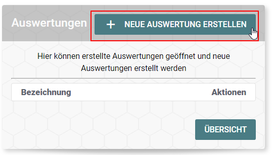 Um eine Auswertung mit einer bereits erstellten Datenlieferung zu erstellen, gehen Sie folgendermaßen vor: Im Fenster der "Aktionsauswahl" navigieren Sie zum Bereich der Auswertungen. Dort finden Sie den Knopf "+ Neue Auswertung erstellen". Durch das Drücken dieses Knopfes starten Sie den Prozess zur Erstellung einer neuen Auswertung, die auf einer Ihrer zuvor hochgeladenen und vorbereiteten Datenlieferungen basiert.