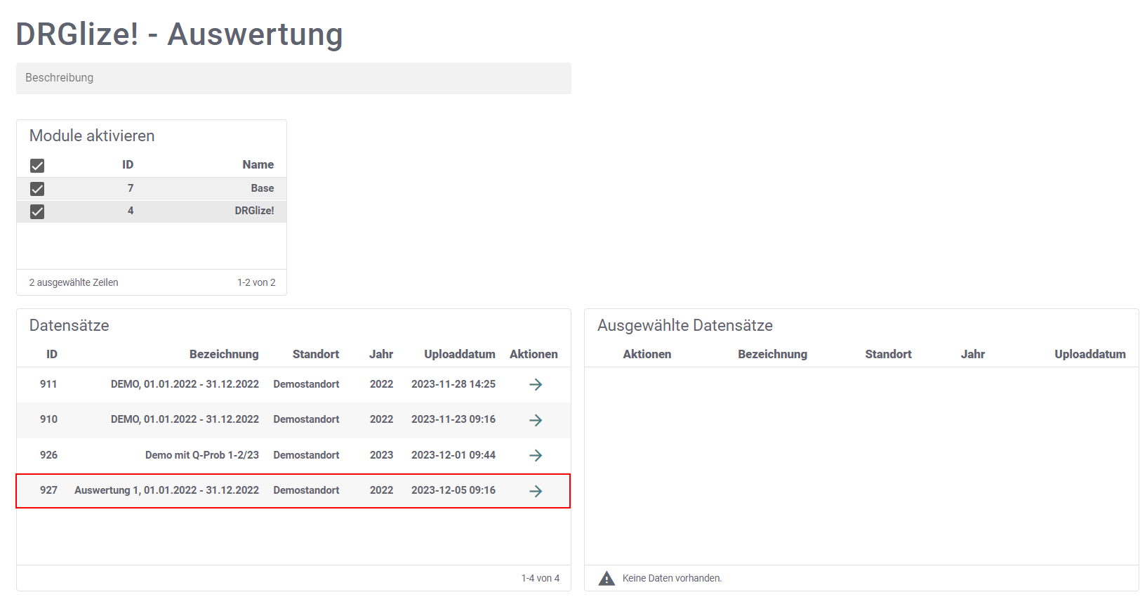 Damit beginnt der Prozess der Erstellung Ihrer Auswertung, basierend auf den ausgewählten Modulen und Datensätzen.