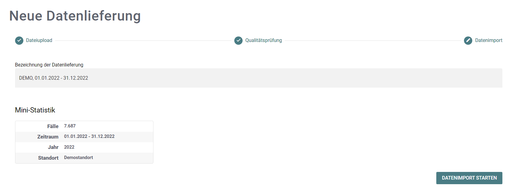 Sobald Sie mit der Bezeichnung und der Überprüfung der Mini-Statistik zufrieden sind, können sie den Prozess weiterführen, indem Sie auf den Knopf "Datenimport starten" klicken.
