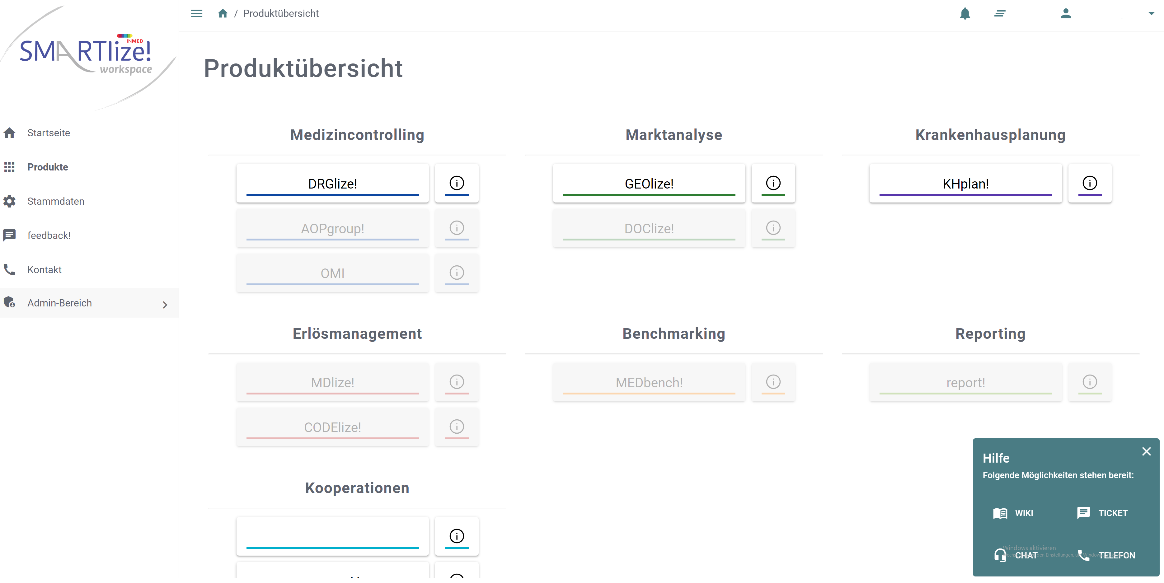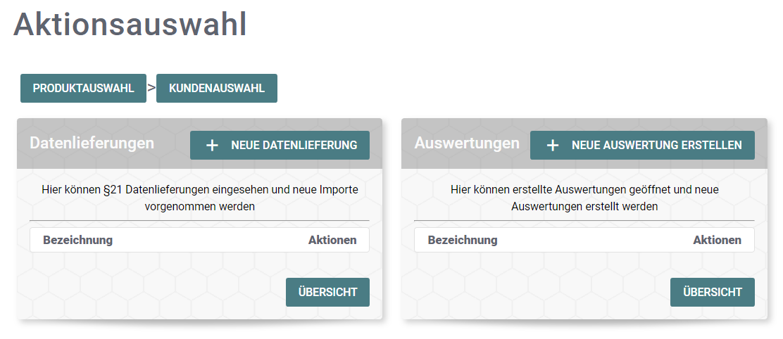 In der Produktübersicht, wird zunächst das Produkt festgelegt, für welches ein neuer Import bzw. Datenlieferung oder eine neue Auswertung erstellt wird.