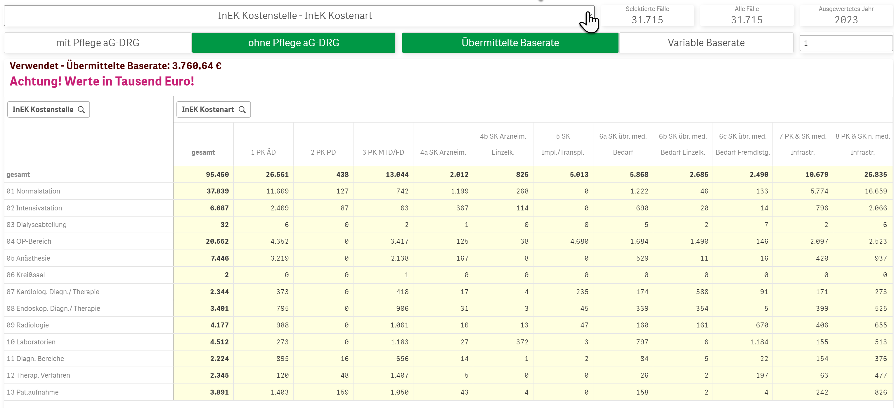 WIchtig ist, dass bei den Sollkosten keine Kosten für Zusatzentgelte enthalten sind. In der Matrix-Ansicht werden alle Kostenstellen mit der Kostenart über eine Matrixtabelle gegenübergestellt. Es kann nach der übermittelten Baserate gerechnet werden, jedoch auch mit einer Variablen Baserate. Die Variable Baserate muss im extra Feldeigenständig eingetragen werden.