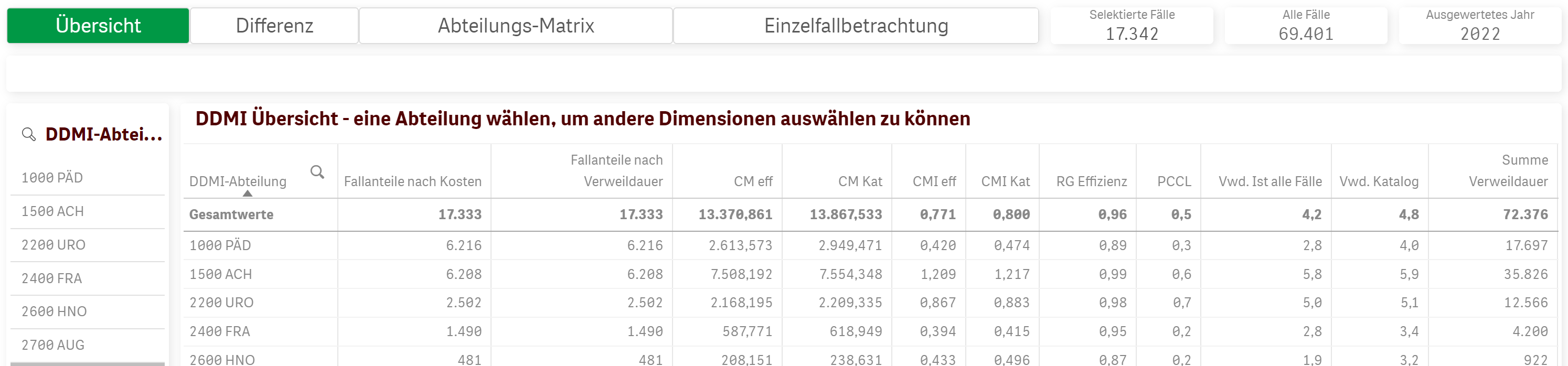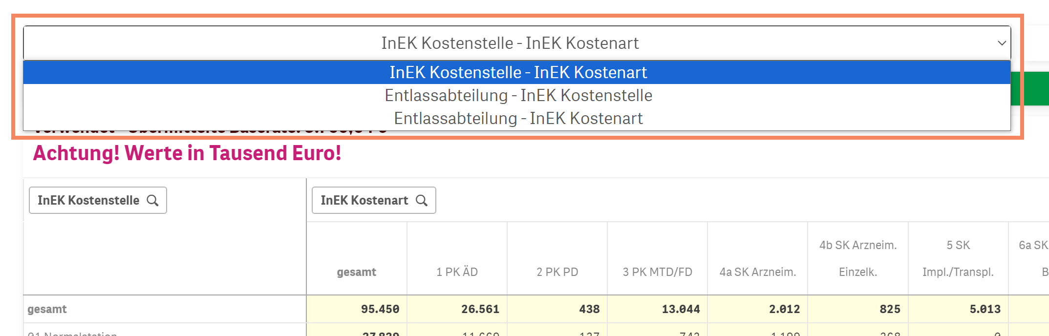 Die Matrix kann nach Kostenstelle und Kostenart dargestellt werden. Jedoch auch nach Entlassabteilung und Kostenstelle oder Kostenart. Siehe untere Abbildung.