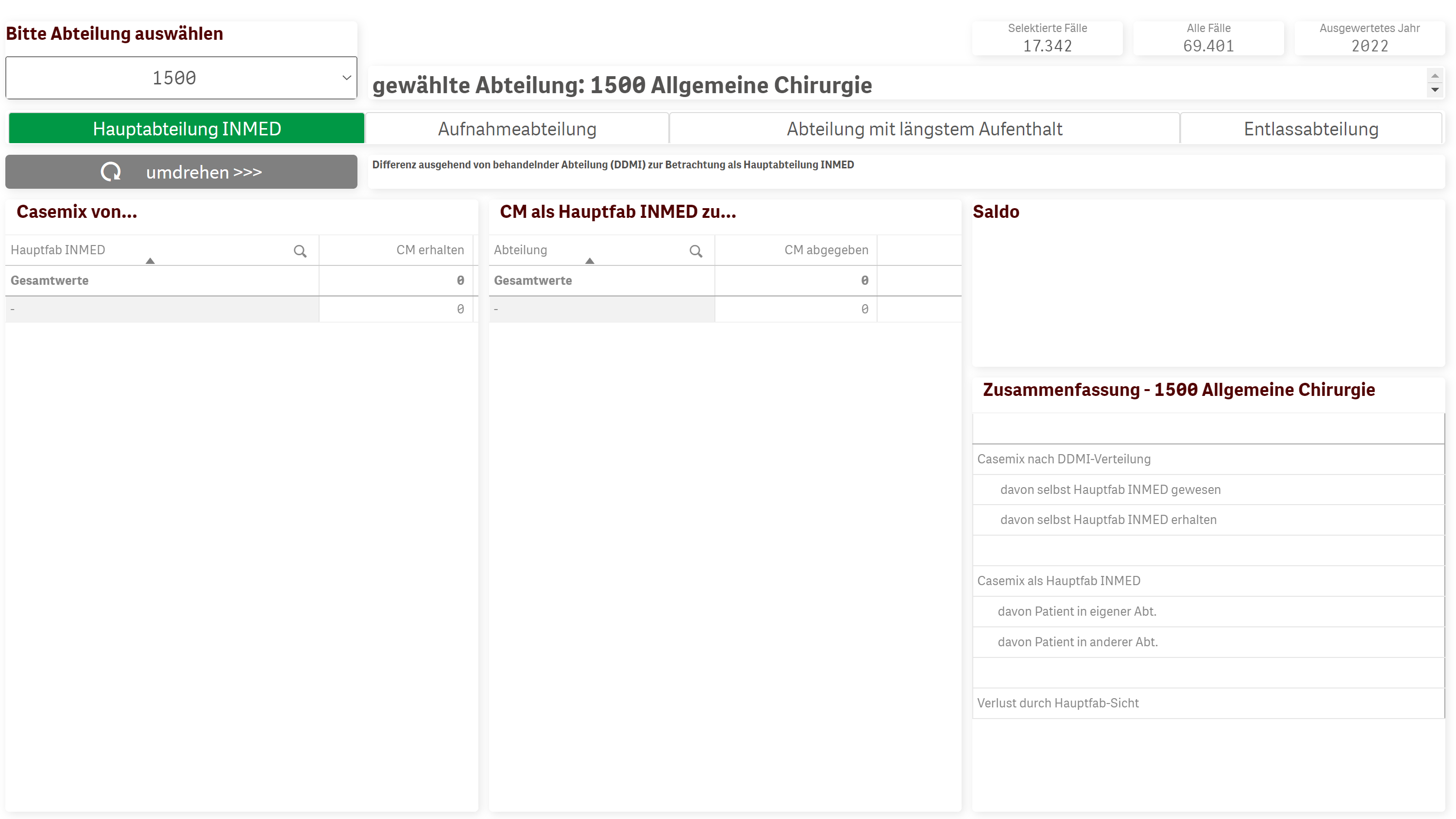 Differenz der Casemix Verteilung nach Hauptabteilung INMED, Aufnahmeabteilung, Abteilungmit längstem Aufenthalt oder Entlassabteilung und Casemix nach DDMI-Vertteilung.