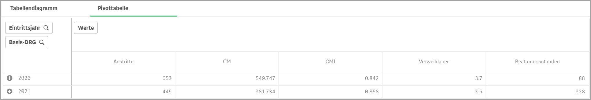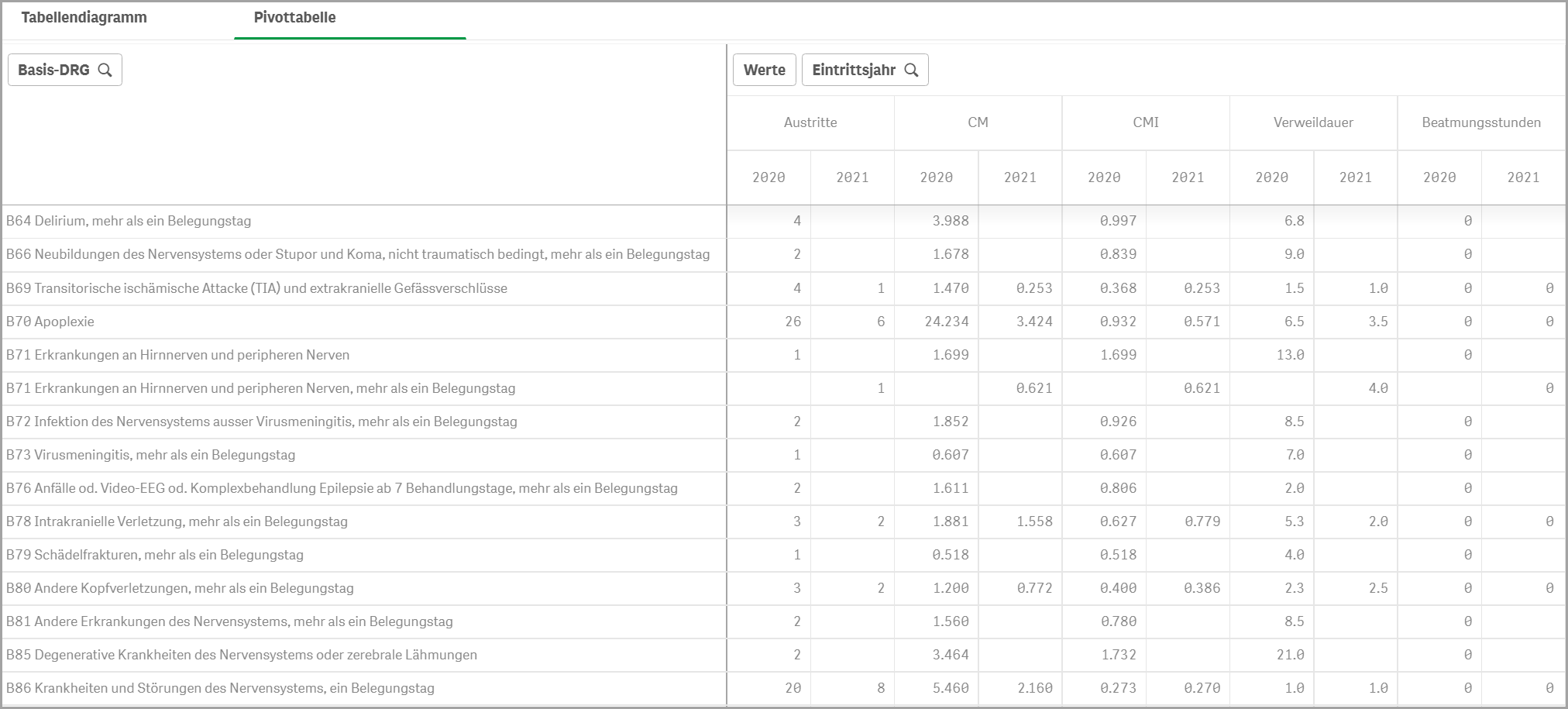 Die Dimensionen (hier im Bild z.B. die Basis-DRG und das Eintrittsjahr) lassen sich in der Pivot-Tabelle per Drag & Drop in eine beliebige Reihenfolge verschieben. So kann beispielsweise das Eintrittsjahr als Spalte zusätzlich zu den Werten dargestellt werden.