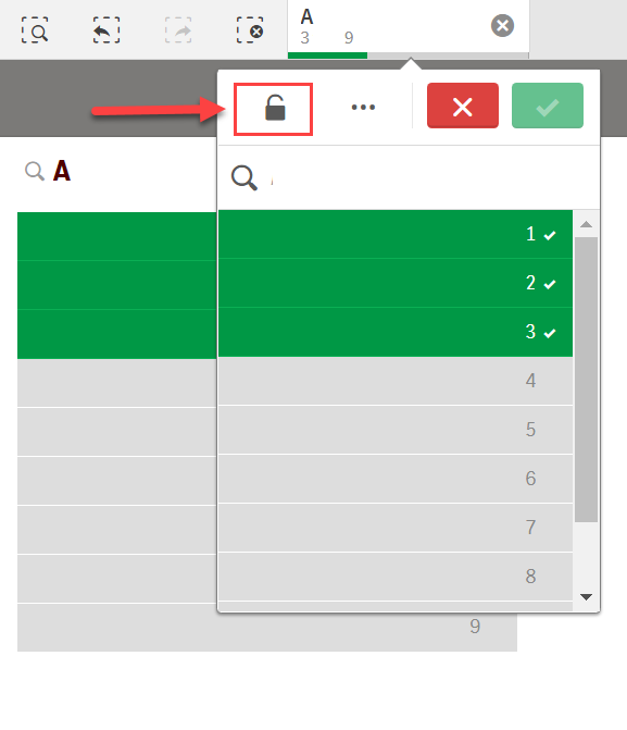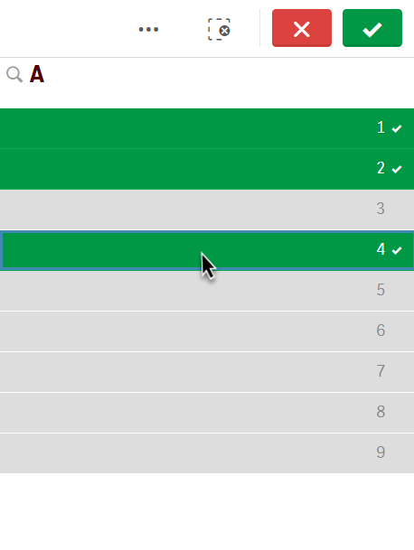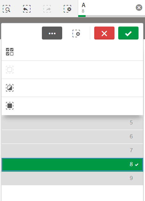 Wird die Lupe angewählt, öffnet sich das Auswahlmenü des jeweiligen Feldes. Hier getätigte Änderungen werden im Arbeitsblatt sofort sichtbar. Durch einen Klick zurück ins Arbeitsblatt oder auf das grüne Häkchen wird die Auswahl bestätigt. Das rote „X“ macht die Auswahl rückgängig.