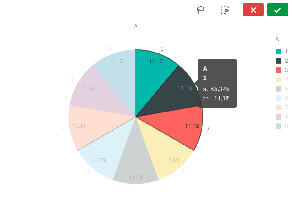 Im folgenden Kreis-Diagramm wurden die Werte 1, 2, 4 und 5 angeklickt und dadurch ausgewählt. Die Auswahl wird mit Klick auf die grüne Schaltfläche mit Häkchen bestätigt. Alternativ genügt es auch, außerhalb der Visualisierung zu klicken.